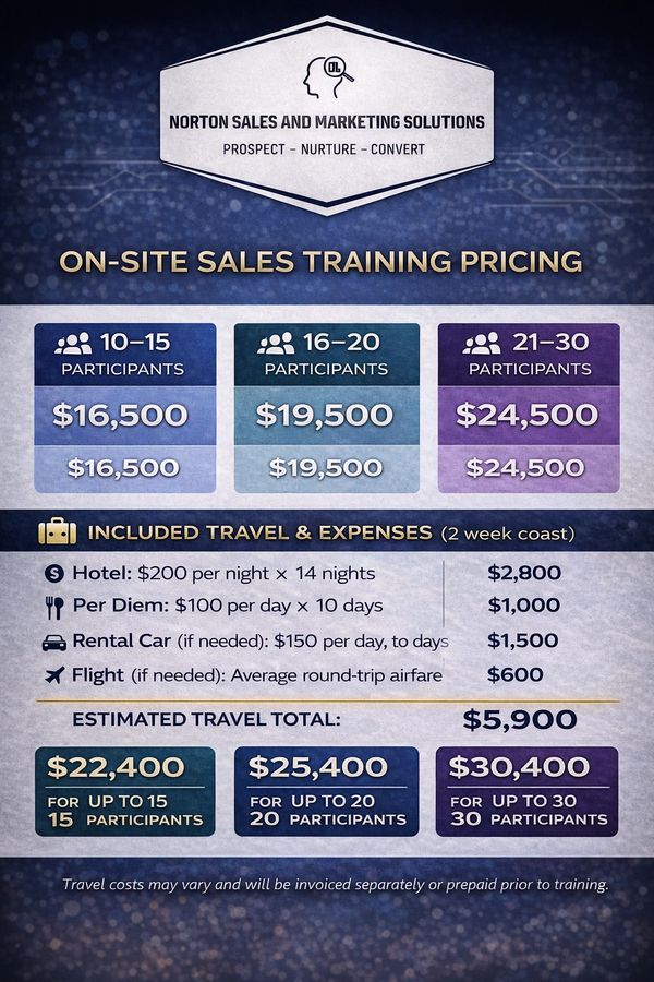 Price reflects On Site Sales Training For teams of 10-30 Participants plus travel and expenses.